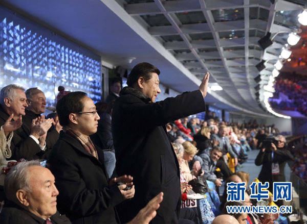 當地時間2月7日晚8時14分,北京時間8日零時14分,第二十二屆冬季奧林匹克運動會在俄羅斯索契隆重開幕。國家主席習近平應俄羅斯總統普京邀請出席開幕式。這是習近平向步入會場的中國代表團奧運健兒揮手致意。新華社記者 蘭紅光 攝