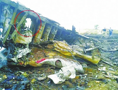 從這張殘骸照片來看,機身上有比臉盆略大的孔洞,破壞方向從機體外部沖向內部,懷疑是導彈的戰斗部碎片擊中的一塊區域。