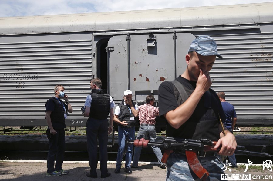 當(dāng)?shù)貢r(shí)間2014年7月20日,烏克蘭頓涅茨克Torez,馬航墜機(jī)遇難乘客遺體被裝上列車?yán)洳剀噹麑⒈贿\(yùn)走。載有部分遺體的火車從距空難現(xiàn)場(chǎng)不遠(yuǎn)的烏克蘭托列茲市出發(fā),前往頓涅茨克市。火車離站前,身處空難現(xiàn)場(chǎng)的歐洲安全與合作組織(歐安組織)代表檢查了運(yùn)載遺體的5節(jié)冷藏車廂。