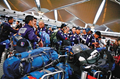 當?shù)貢r間7月18日,馬來西亞國際機場,馬來西亞派特殊救災和救援小組成員前往MH17墜機事故現(xiàn)場。圖/CFP