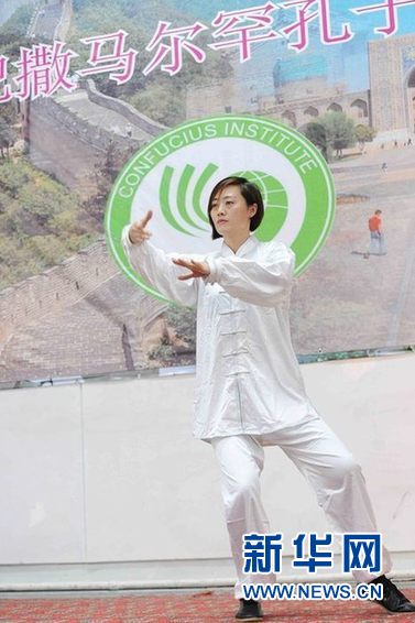 ????11月27日,烏茲別克斯坦撒馬爾罕國立外國語學院禮堂,上海外國語大學李海榮老師在表演太極拳。(新華網記者 沙達提 攝)