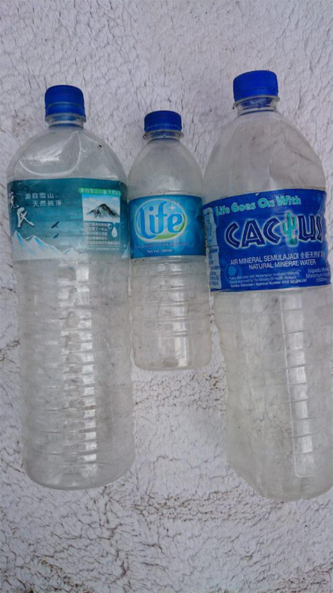 圖為當(dāng)?shù)芈蓭煱l(fā)現(xiàn)的三個礦泉水瓶,其中一個標(biāo)有中文字樣