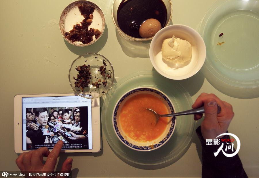 2014年3月11日,山東濟南,一名市民一邊吃著早餐,一邊翻閱IPAD,關注失聯航班MH370的最新動態。