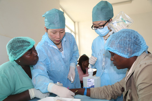 2014年12月10日,解放軍援塞醫(yī)療隊為中塞友好醫(yī)院由留觀中心轉型為留觀診療中心開展輸液培訓活動。這是中方隊員在教授塞方護理人員留置針的穿刺方法。 新華社發(fā)(戴欣 攝)