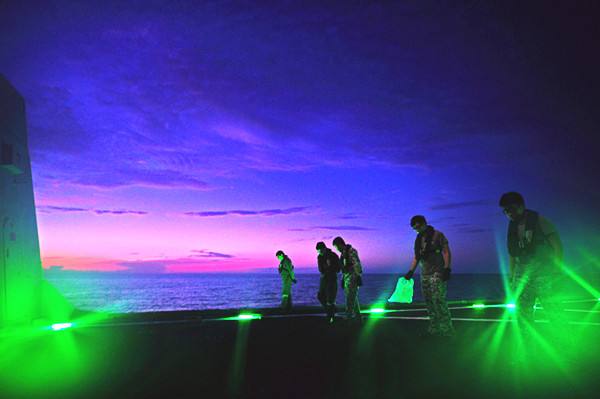 圖為 2015年5月25日,新加坡海軍“剛毅”號護衛艦士兵進行直升機起降準備工作。當日,中國海軍“玉林”號導彈護衛艦與新加坡海軍“剛毅”號護衛艦、“奮勇”號導彈巡邏艦在馬來半島以東海域順利完成了代號為“中新合作-2015”的海上雙邊軍事演習。這是中新兩國首次進行的雙邊海上軍事演習。