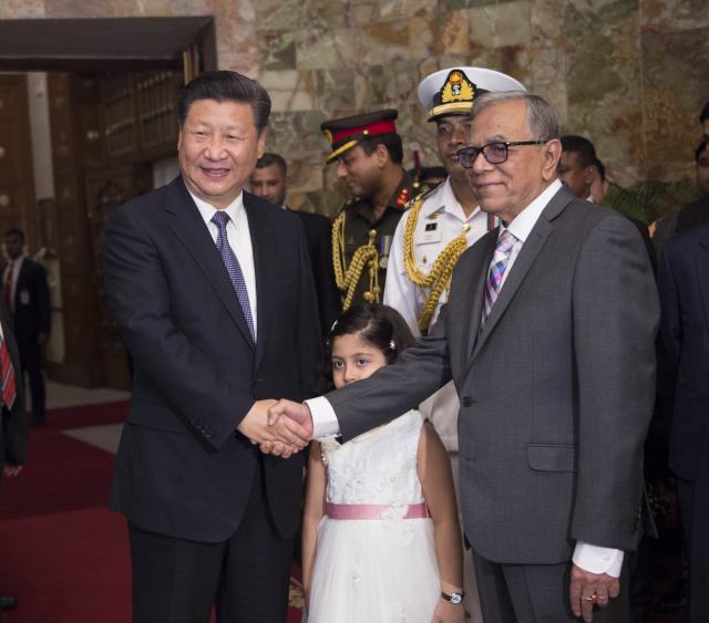 【中孟兩國友誼代代相傳再寫佳話】14日中午,習(xí)近平主席抵達(dá)孟加拉國首都達(dá)卡,在機(jī)場受到熱烈歡迎。哈米德總統(tǒng)親自到機(jī)場迎接,并帶來自己的小孫女向習(xí)主席獻(xiàn)上鮮花。無獨(dú)有偶,1956年,周恩來總理訪問孟加拉國時(shí),孟加拉國國父拉赫曼帶著女兒向周總理獻(xiàn)花。當(dāng)年那位獻(xiàn)花的小姑娘正是現(xiàn)在的孟加拉國總理哈西娜。習(xí)主席深情地對孟加拉國領(lǐng)導(dǎo)人說:“這是中孟兩國友誼代代相傳的佳話。”