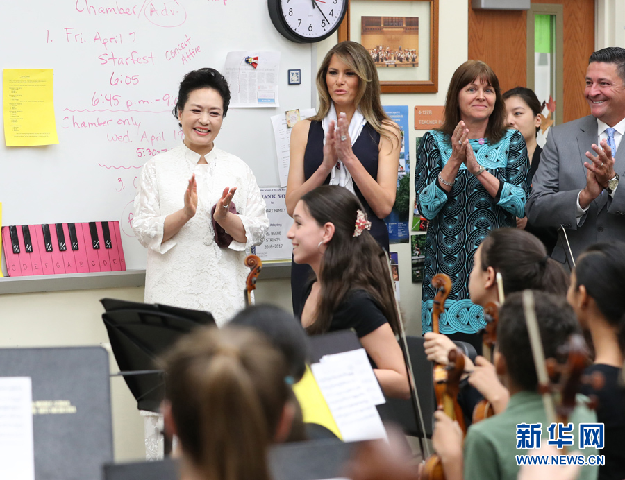 彭麗媛抵達(dá)時(shí),梅拉尼婭和棕櫚灘郡學(xué)區(qū)長阿沃莎、巴克藝術(shù)中學(xué)校長羅贊基等在停車處熱情迎接。彭麗媛先后參觀了聲樂教室、交響樂隊(duì)教室、弦樂教室,欣賞學(xué)生演唱和樂隊(duì)表演,并同學(xué)生們親切互動交流。隨后,彭麗媛觀摩了時(shí)政經(jīng)濟(jì)課,回答了學(xué)校小記者關(guān)于“你和藝術(shù)的淵源”的提問,并接受了學(xué)生自己創(chuàng)作的水彩畫。彭麗媛表示,中美兩國可以加強(qiáng)藝術(shù)交流合作。希望巴克藝術(shù)中學(xué)的老師和同學(xué)們以教育和藝術(shù)為橋梁,為增進(jìn)中美兩國人民友好、推動兩國關(guān)系發(fā)展作出更多貢獻(xiàn)。