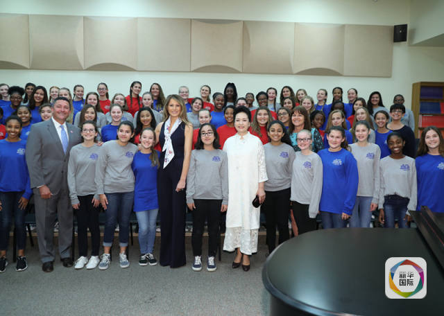 當地時間4月7日上午,應美國總統夫人梅拉尼婭邀請,國家主席習近平夫人彭麗媛參觀位于佛羅里達州西棕櫚灘市的巴克藝術中學。這是彭麗媛同梅拉尼婭在參觀聲樂教室后與學生們合影。(新華社記者丁林攝)