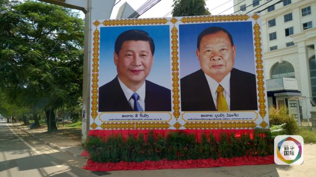 在老撾國(guó)家主席府正門,懸掛著習(xí)近平主席和老撾國(guó)家主席本揚(yáng)的大幅畫像。乘車路過(guò)的老撾青年人朝在主席府外采訪的中國(guó)記者熱情打著招呼,歡笑聲灑了一路。