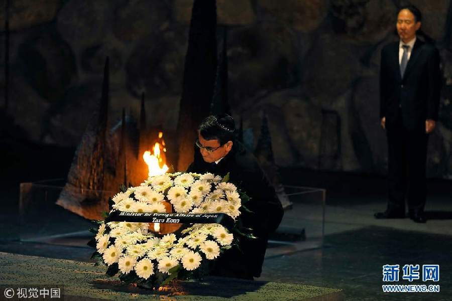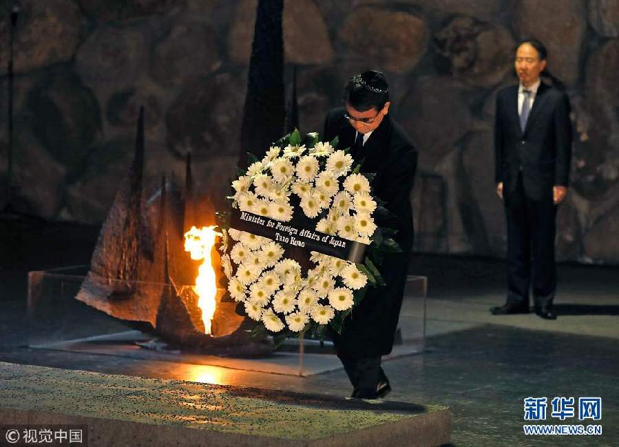 12月25日,耶路撒冷,日本外相河野太郎訪問耶路撒冷,參觀大屠殺紀念館,獻花悼念死難者。(圖片來源:視覺中國)