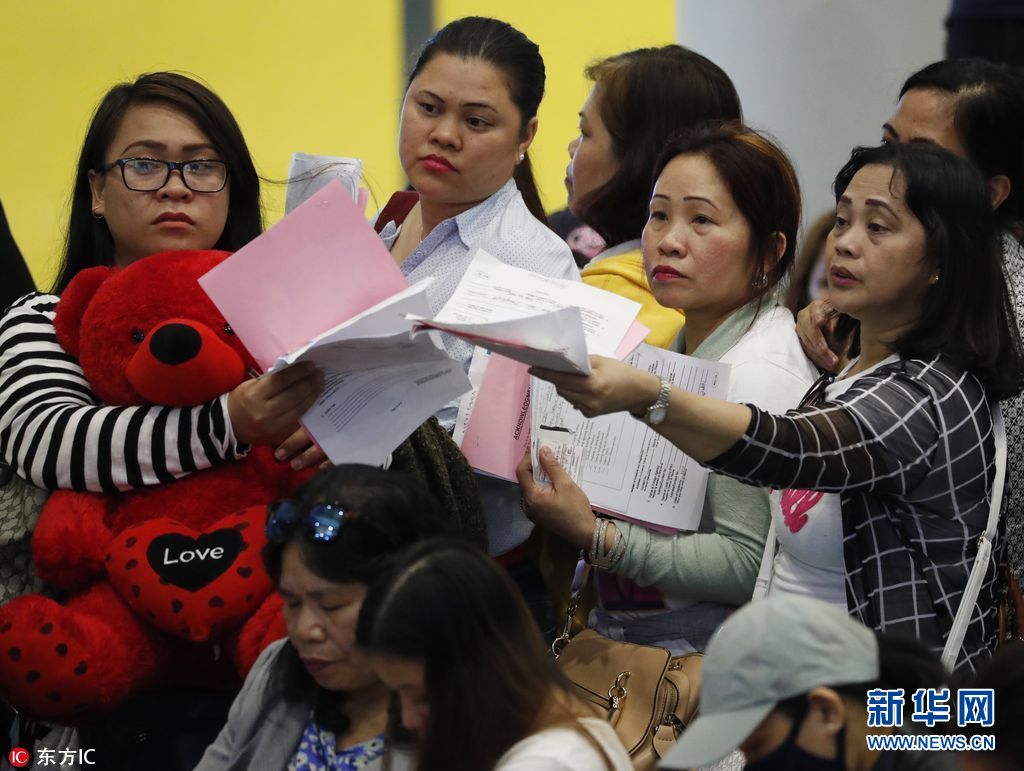 當地時間2018年2月21日,菲律賓馬尼拉,從科威特返回的菲律賓海外勞工抵達馬尼拉國際機場。據外媒報道,宿霧太平洋航空公司為至少396名海外菲律賓工人提供空運支持,助其免費搭乘飛機回家。據悉,菲律賓政府已下令禁止民眾前往科威特務工。據悉,菲律賓總統杜特爾特稱,近來有在科威特打工的菲律賓女傭因不堪虐待或性侵選擇自殺。(圖片來源: 東方IC)