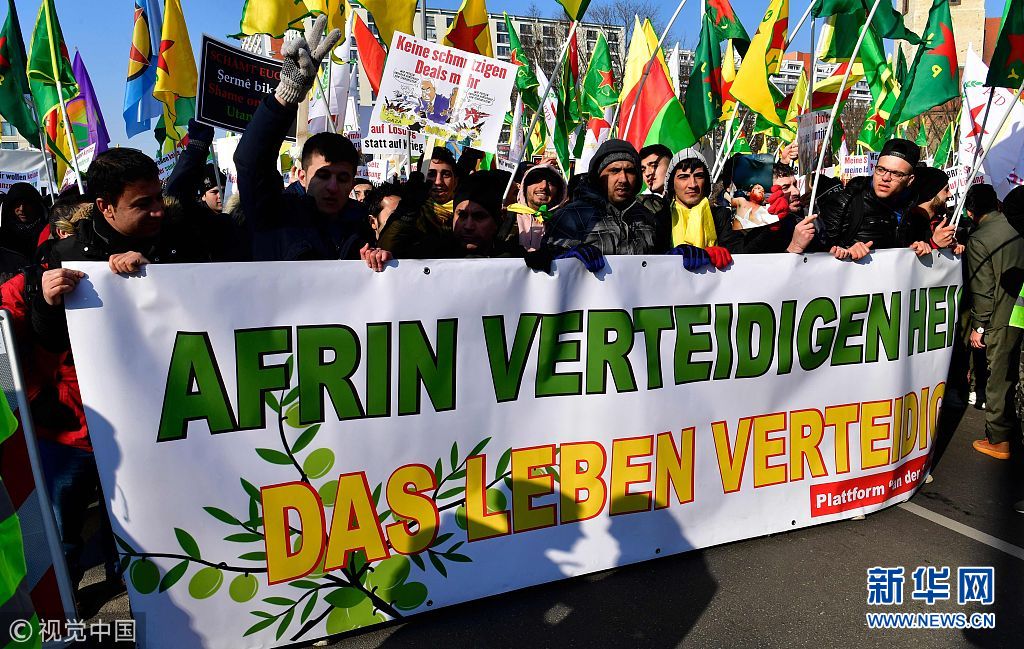 當地時間2018年3月3日,德國柏林,當地民眾舉行游行,抗議土耳其對敘利亞阿夫林地區的庫爾德人采取軍事行動。(圖片來源:視覺中國)