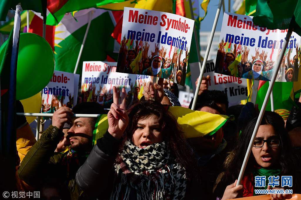 當地時間2018年3月3日,德國柏林,當地民眾舉行游行,抗議土耳其對敘利亞阿夫林地區的庫爾德人采取軍事行動。(圖片來源:視覺中國)