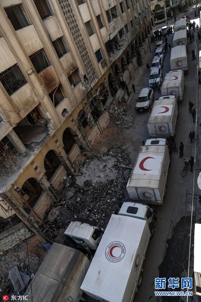 當地時間2018年3月9日,敘利亞,推遲多日后,人道主義救援物資進入東古塔反政府武裝控制區并完成卸貨,共13卡車物資當天上午從瓦菲丁通道進入杜馬區。(圖片來源:東方IC)