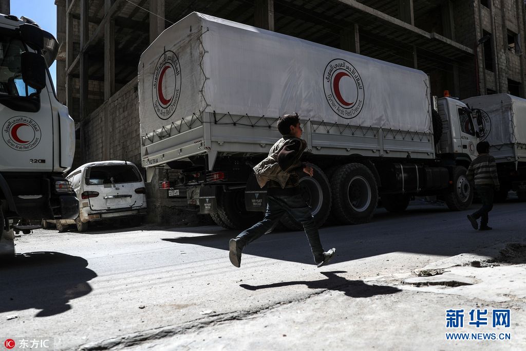 當地時間2018年3月9日,敘利亞,推遲多日后,人道主義救援物資進入東古塔反政府武裝控制區并完成卸貨,共13卡車物資當天上午從瓦菲丁通道進入杜馬區。(圖片來源:東方IC)