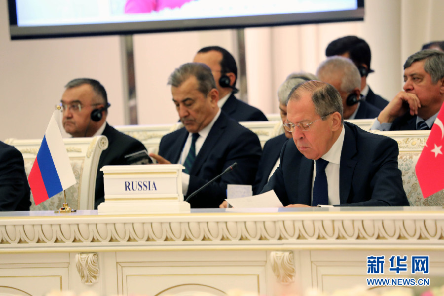 俄羅斯外長拉夫羅夫(前排右一)出席會議。阿富汗問題高級別會議27日在烏茲別克斯坦首都塔什干舉行。新華社記者周良攝