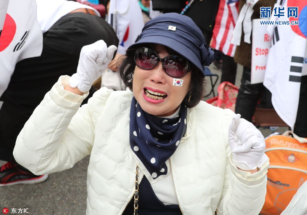 當地時間2018年4月6日,韓國首爾,在首爾中央地方法院前,舉行集會的韓國前總統樸槿惠的支持者得知樸槿惠一審獲刑24年傷心落淚。據報道,首爾中央地方法院對韓國前總統樸槿惠作出一審宣判,判處其有期徒刑24年,罰款180億韓元(約合人民幣1.06億元)。(圖片來源:東方IC)