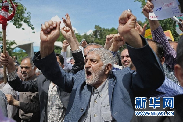 在當天的示威活動中,伊朗民眾手持“維護伊核協(xié)議、維護地區(qū)和平”和“伊朗不懼外來威脅”等標語并高呼口號。