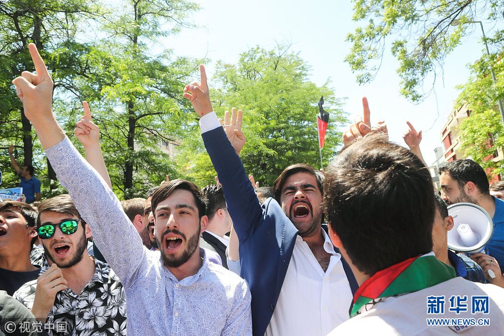 5月15日,土耳其安卡拉,示威者在以色列領事館附近投擲雞蛋和石塊,抗議美國駐以色列使館遷至耶路撒冷。(圖片來源:視覺中國)