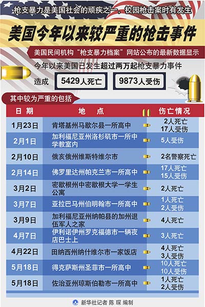 新華社北京5月19日電 新聞背景:美國(guó)今年以來(lái)較嚴(yán)重的槍擊事件