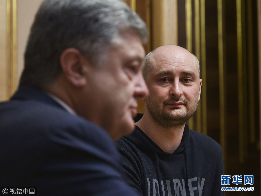 5月30日,烏克蘭基輔,烏克蘭總統波羅申科會見此前被報道“死亡”的俄羅斯記者巴布琴科。(圖片來源:視覺中國)