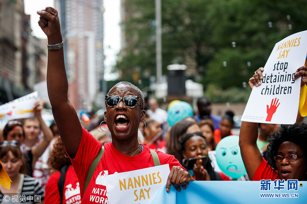 當(dāng)?shù)貢r間2018年7月18日,美國紐約,包括托兒所從業(yè)人員、父母及其子女在內(nèi)的社會各界人士在美國移民和海關(guān)執(zhí)法局(ICE)附近組織示威游行,抗議特朗普政府近期在美國南部邊境實施針對非法移民家庭的強制拘留和家庭成員離散政策。當(dāng)天,共和黨領(lǐng)導(dǎo)的眾議院通過了支持ICE的決議,并譴責(zé)一些民主黨人和進步積極分子要求廢除ICE的呼聲。(圖片來源:視覺中國)
