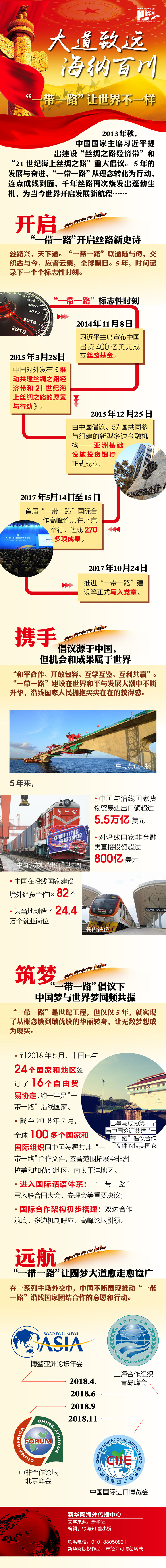 5年的發展與奮進,“一帶一路”從理念轉化為行動,連點成線到面,在廣袤大陸上落地生根,在浩瀚海洋中乘風破浪,千年絲路再次煥發出蓬勃生機,為當今世界開啟發展新航程……