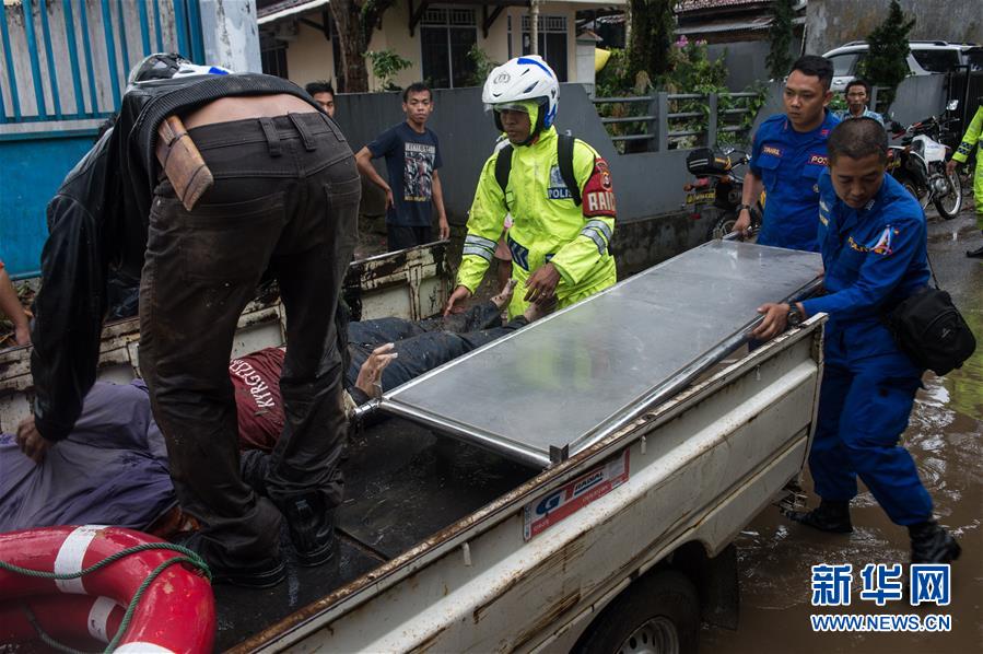 12月23日,在印度尼西亞萬丹省板底蘭,救援人員在運送遇難者遺體。印度尼西亞抗災署23日晚說,該國西部巽他海峽22日晚發生的海嘯造成的遇難者人數已升至222人。 新華社發(維里 攝)