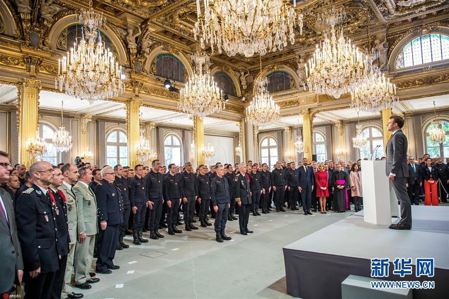 當?shù)貢r間2019年4月18日,法國巴黎,法國總統(tǒng)馬克龍在愛麗舍宮接見參與巴黎圣母院火災救援任務的消防員。(圖片來源:東方IC)