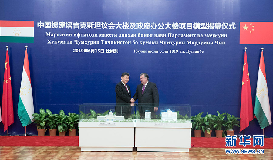 6月15日,國家主席習近平在杜尚別同塔吉克斯坦總統拉赫蒙會談。會談后,兩國元首共同出席中方援塔議會大樓、政府辦公大樓項目模型揭幕儀式。 新華社記者 王曄 攝