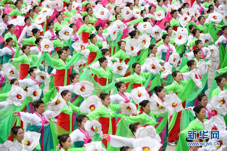 明媚的陽(yáng)光下,錦繡山太陽(yáng)宮廣場(chǎng)顯得格外雄偉,金日成、金正日的巨幅畫像并排高高懸掛,大型花壇鋪展在寬闊的廣場(chǎng)中間。錦繡山太陽(yáng)宮廣場(chǎng)上,歡迎的人群身著節(jié)日的盛裝,呈方陣排列。