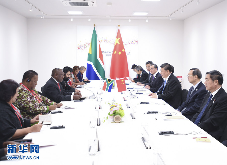 ?6月28日,國家主席習近平在大阪會見南非總統拉馬福薩。 新華社記者 燕雁 攝