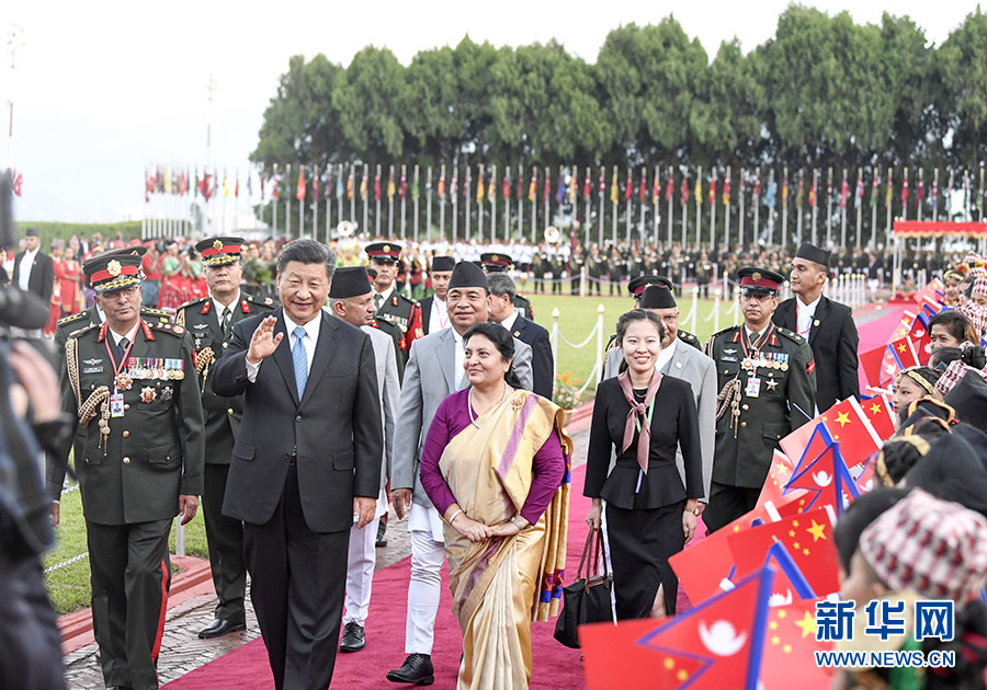 10月12日,國家主席習(xí)近平乘專機抵達(dá)加德滿都,開始對尼泊爾進行國事訪問。尼泊爾總統(tǒng)班達(dá)里在機場為習(xí)近平舉行具有濃郁尼泊爾民族特色的歡迎儀式。這是習(xí)近平在班達(dá)里陪同下檢閱儀仗隊。 新華社記者 李學(xué)仁 攝