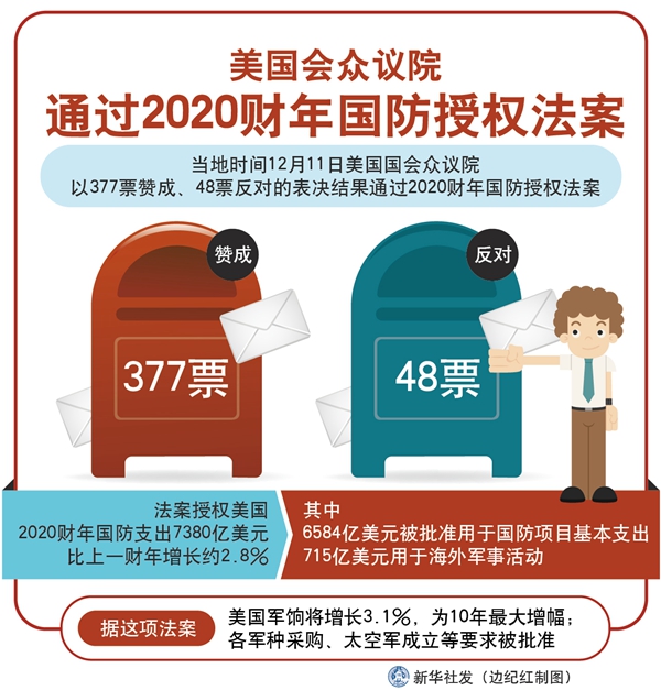 新華社華盛頓12月11日電(記者孫丁 徐劍梅)美國(guó)國(guó)會(huì)眾議院11日以377票贊成、48票反對(duì)的表決結(jié)果通過(guò)2020財(cái)年國(guó)防授權(quán)法案。