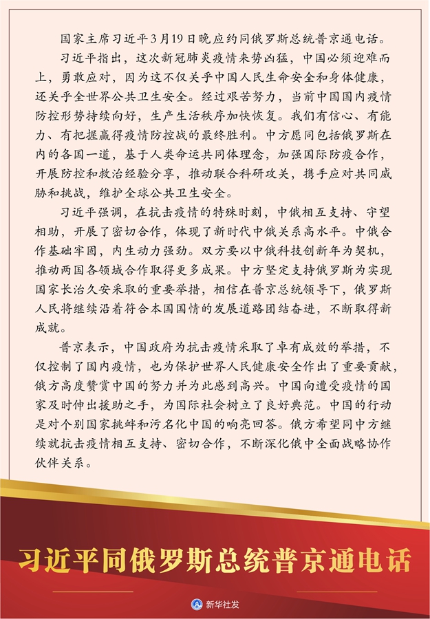 普京表示,中國政府為抗擊疫情采取了卓有成效的舉措,不僅控制了國內(nèi)疫情,也為保護世界人民健康安全作出了重要貢獻,俄方高度贊賞中國的努力并為此感到高興。中國向遭受疫情的國家及時伸出援助之手,為國際社會樹立了良好典范。中國的行動是對個別國家挑釁和污名化中國的響亮回答。俄方希望同中方繼續(xù)就抗擊疫情相互支持、密切合作,不斷深化俄中全面戰(zhàn)略協(xié)作伙伴關(guān)系。