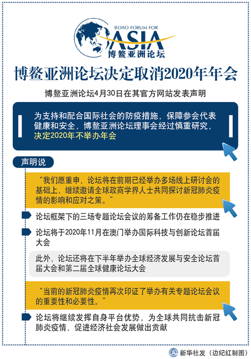 新華社北京4月30日電(記者劉紅霞)博鰲亞洲論壇30日在其官方網(wǎng)站發(fā)表聲明,為支持和配合國際社會的防疫措施,保障參會代表健康和安全,博鰲亞洲論壇理事會經(jīng)過慎重研究,決定2020年不舉辦年會。