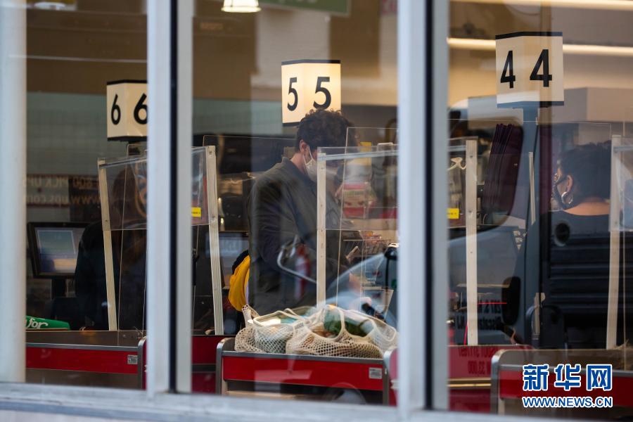 11月12日,在美國(guó)紐約一家超市,人們?cè)谘b有防護(hù)罩的收銀臺(tái)前結(jié)賬。新華社發(fā)(郭克攝)