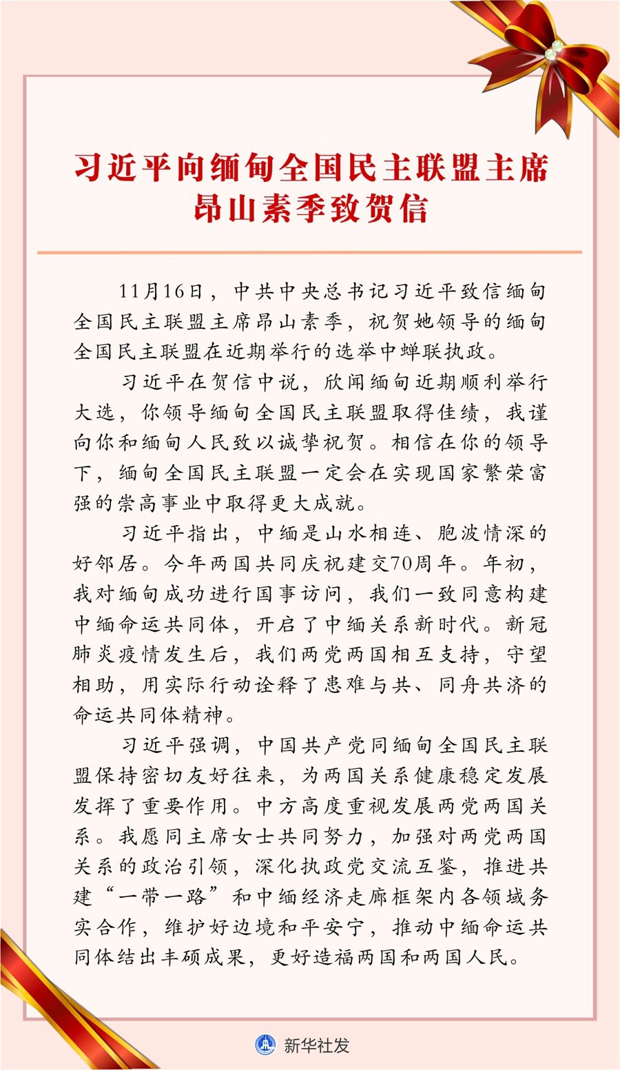 新華社北京11月17日電 11月16日,中共中央總書記習近平致信緬甸全國民主聯盟主席昂山素季,祝賀她領導的緬甸全國民主聯盟在近期舉行的選舉中蟬聯執(zhí)政。