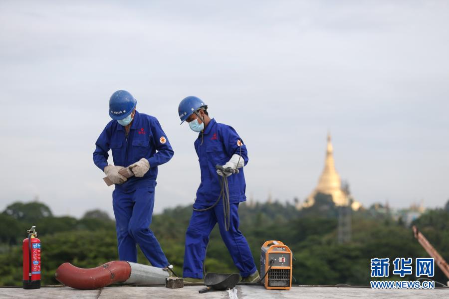 10月28日,在緬甸仰光的國家劇院維修改造項(xiàng)目現(xiàn)場(chǎng),覺泰昂在師父的指導(dǎo)下焊接鋼管。新華社發(fā)(吳昂攝)